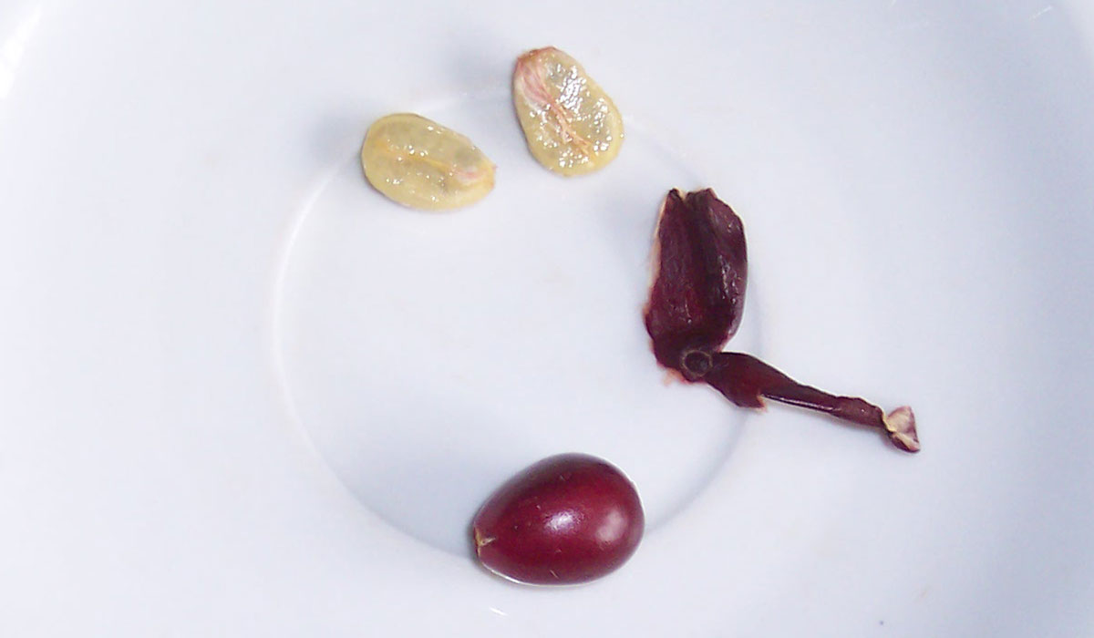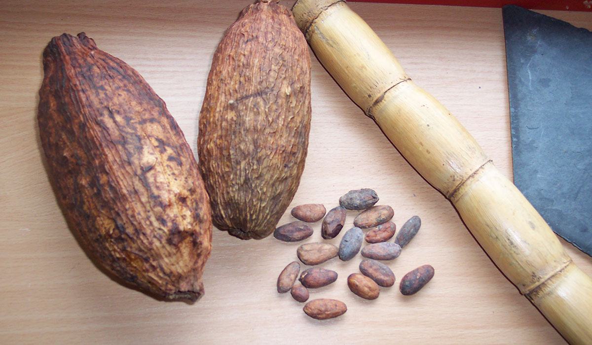 Getrocknete Kakaoschoten, Kakaosamen und Zuckerrohr
